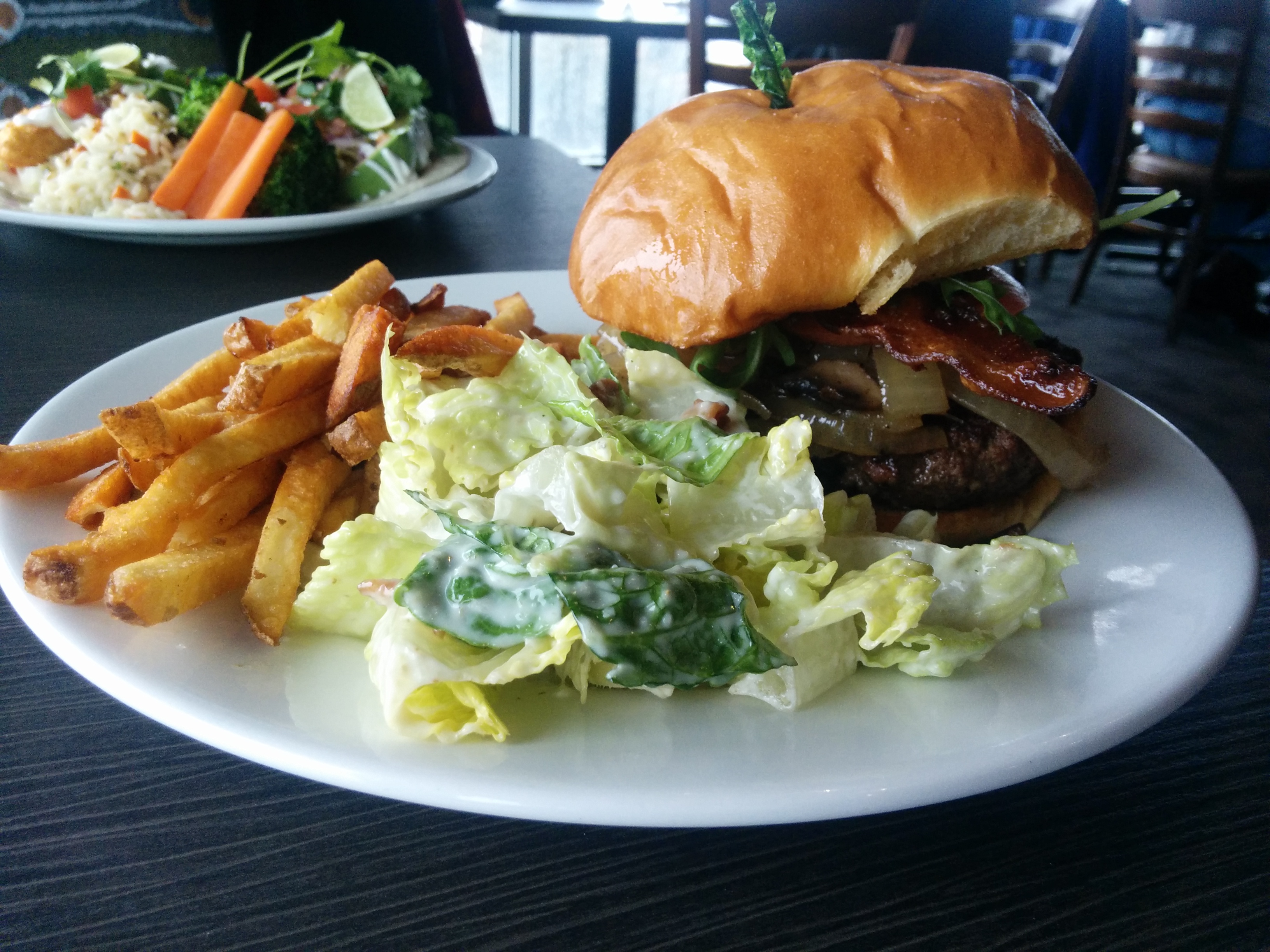 The Thai curry and coconut mussels ($12.00) were plump, fresh and flavourful. Two pieces of crusty garlic bread were included to sop up the delicious sauce. The fish tacos ($11.50 for two) offered fresh haddock very lightly coated, wrapped in tortillas and garnished with salsa, avocado and cilantro. Good, but not great. (I crave more crunch in my fish tacos.) The Millstone burger ($14.75) was a thing of beauty: a glossy, tasty bun, thick juicy hamburger patty, sautéed mushrooms and onions, brie, bacon and arugula, served with crispy fries and a not-too-garlicky Caesar salad. Wow!